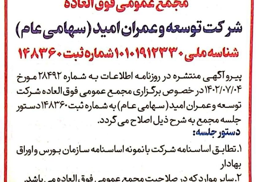 برگزاری مجمع عمومی فوق العاده شرکت توسعه و عمران امید(سهامی عام)